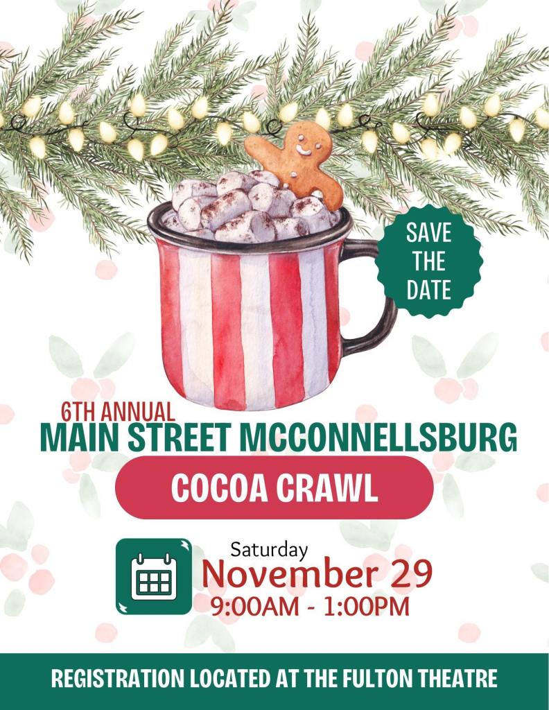 - Main Street McConnellsburg is excited to announce that the 6th annual Cocoa Crawl is scheduled for November 29, 2025, from 9:00 a.m. to 1:00 p.m. Registration will take place at the Fulton Theatre, located at 100 Lincoln Way East, McConnellsburg, PA 17233.